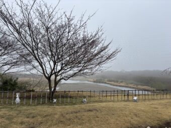 👇ログハウスの向こう側のソメイヨシノはいよいよ本番